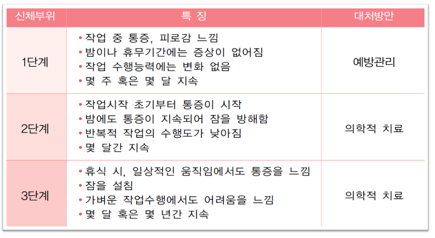 근골격계 증상의 단계는 1단계에서 부터 3단계까지로 구분할 수 있습니다. 1단계는 작업 중 통증, 피로감을 느끼지만 밤이나 휴무기간에는 증상이 사라집니다, 또 작업능력 수행에는 영향을 주지 않습니다.