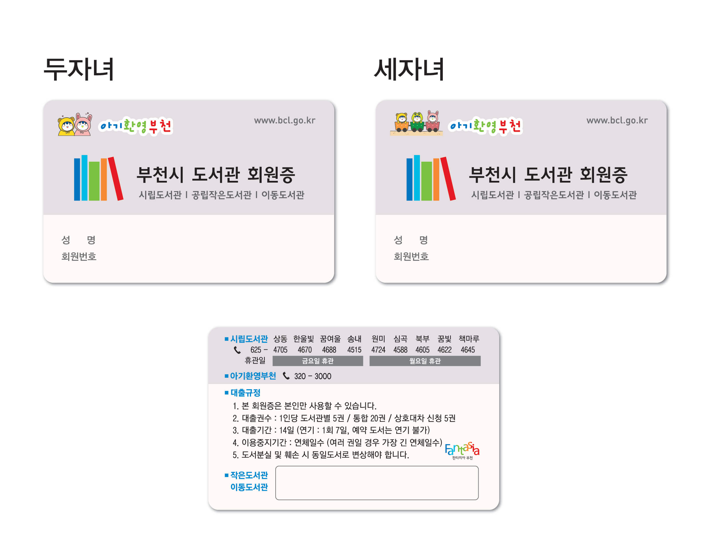 다자녀 인원수에 따라 인증 스티커 모양이 다릅니다. 2자녀는 아이 두 명이 그려져 있고, 3자녀는 아이 세명이 그려져 있습니다. 기존 도서 회원증을 가지고 있는 분이라면 다자녀 가장을 확인할 수 있는 증빙서류 지참 후 도서관 방문하시면 스티커를 바로 붙여 줍니다. 저는 상동역에 있는 칙칙폭폭 도서관에서 서류 확인 후 바로 스티커를 부착받았습니다.