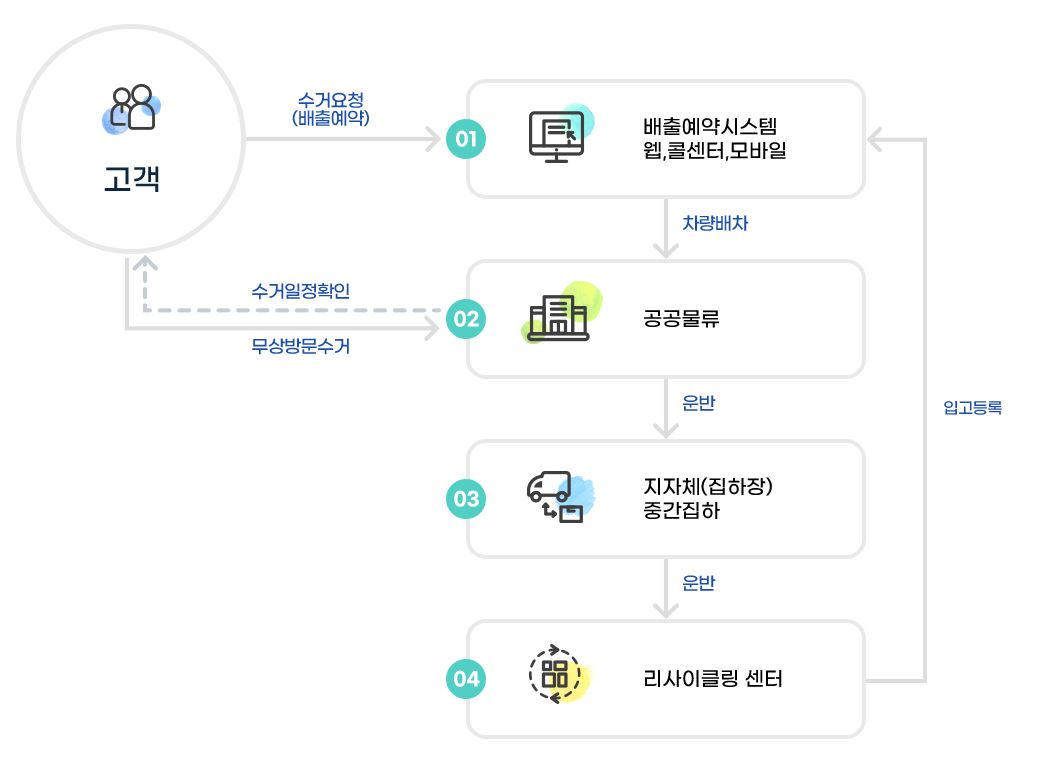 환경부, 지방자치단체, 전자제품 생산자가 협업하여 시민들이 손쉽게 예약 한 번으로 폐가전제품을 무상으로 배출할 수 있도록 새로운 수거체계를 구축하여 “한국 전자제품 자원순환 공제조합”에서 위탁 운영하고 있습니다.