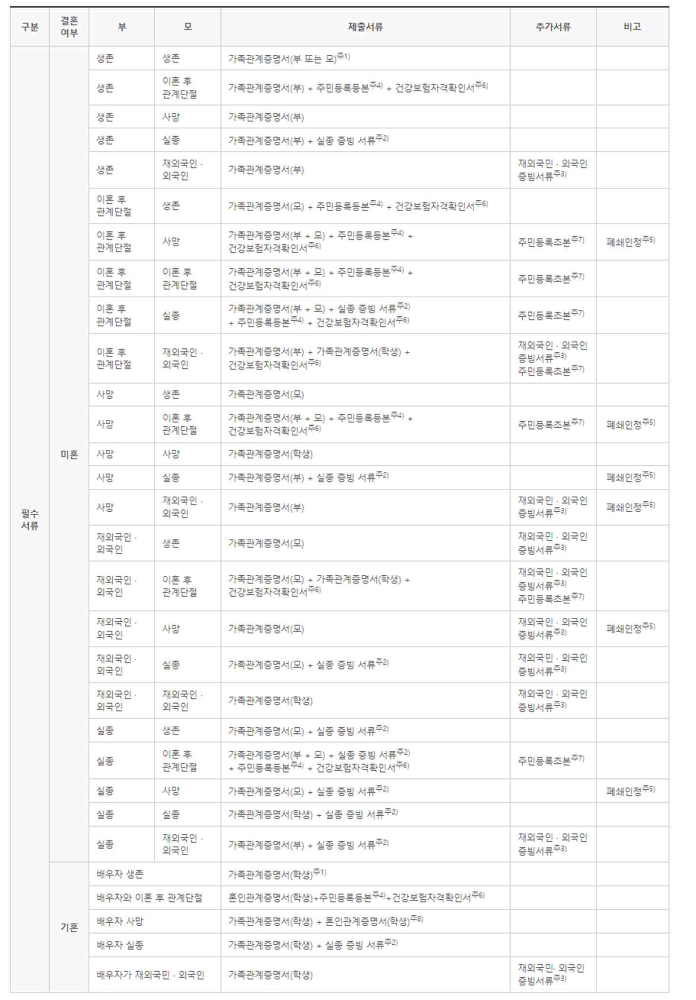 주 3) 재외국민·외국인 증빙서류: 가족관계 증명서로 확인이 안 되는 경우,①재외국민(재외국민 주민등록증, 재외국민 등록부등본), ②외국인(외국인등록사실증명, 국내거소 사실증명원, 여권사본, 출입국 사실증명원 또는 주민등록 초본(주소변경 포함))