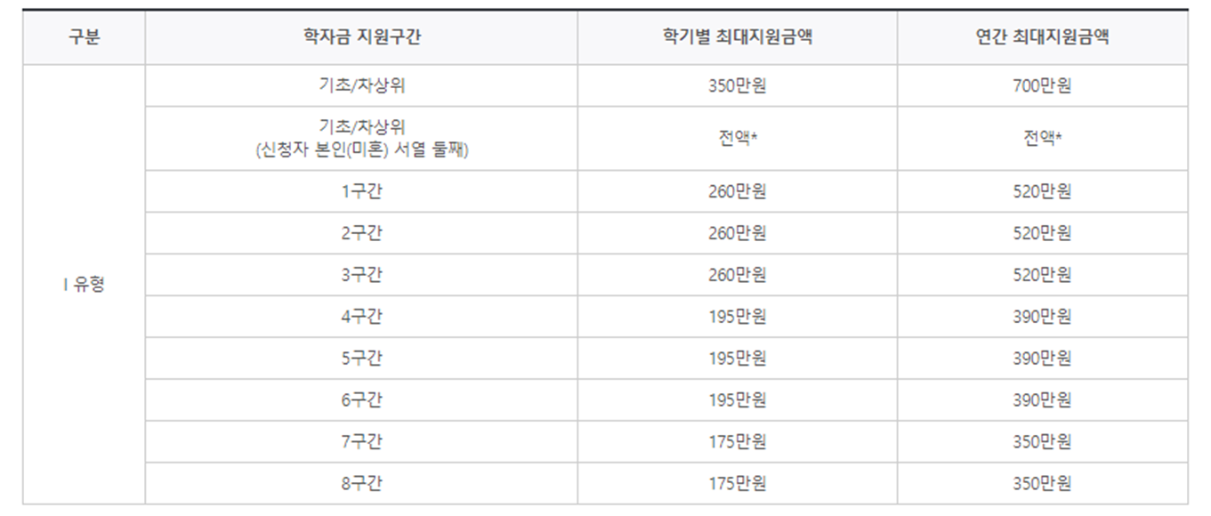 국가장학금Ⅰ유형(학생 직접 지원형) 지원금액