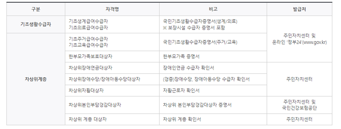기초, 차상위 대상자는 본인 또는 가구원(미혼은 부 또는 모, 기혼은 배우자로 가구원 동의가 완료된 가구원) 명의의 서류 제출, 매 학기 자격확인 진행