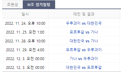 대한민국 H조 경기 일정