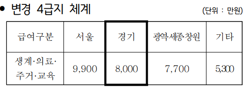 | 경기도형 긴급복지 지원사업 | ∘ 지원기준 - 기준 중위소득 90% 이하 ∘ 생계지원 - 1인 가구 : 583,400원 |