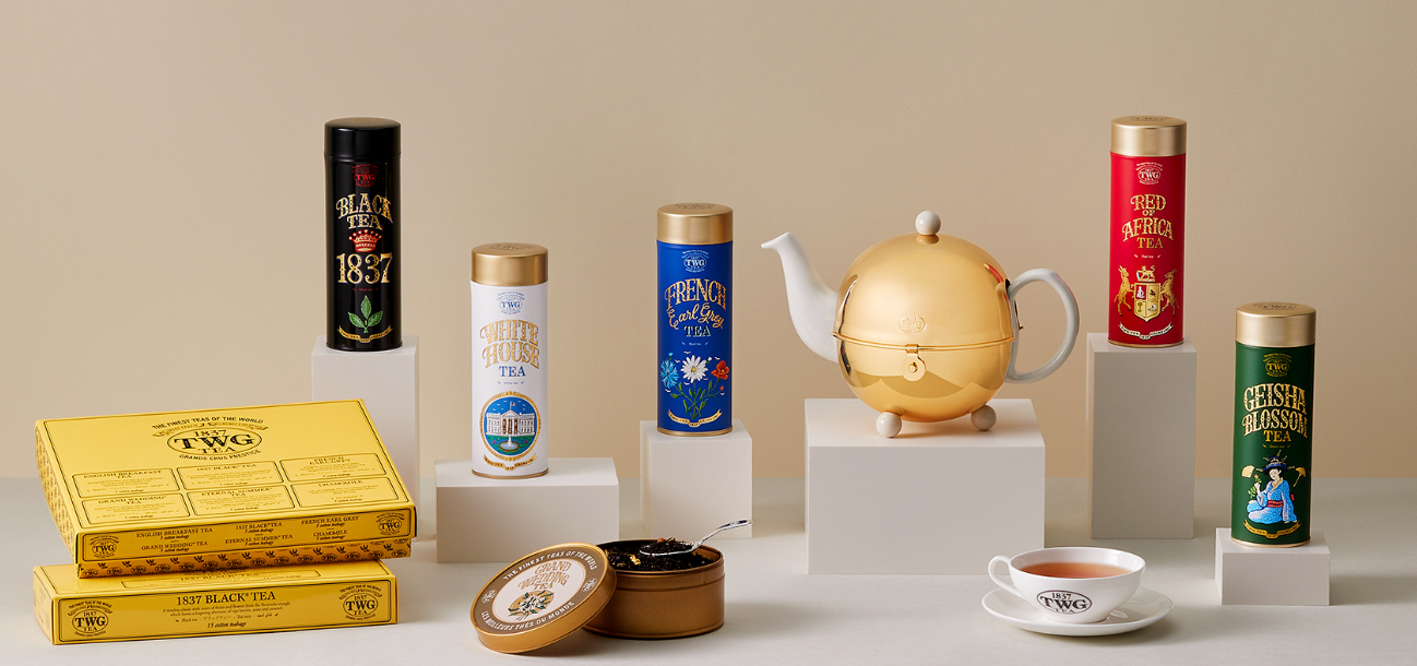 TWG는 The Wellbeing Group의 약자로 2008년 싱가포르에서 설립된 티 브랜드입니다. 로고에 적힌 1837은 싱가포르 상공회의소가 설립된 해로, 싱가포르가 무역항으로서 차와 향신료를 거래하기 시작한 역사를 기념하는 것입니다 . TWG는 세계 36개국에서 엄선된 산지의 찻잎을 사용하고 있으며 향차, 오리지널 블렌딩티 등 약 800여 종류 이상의 차를 즐길 수 있습니다. TWG는 티 브랜드가 아닌 럭셔리 브랜드로 자신을 규정하며, 고품격 잎차의 풍미가 담긴 감각적인 디자인의 틴과 패키지를 제공합니다.