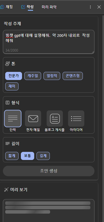 빙 챗gpt에 챗팅말고 작성창에 들어가서 간단하게 질문을 해보도록 하겠습니다. 질문 내용은 '빙 챗gpt에 대해 설명해줘'라고 써보도록 하겠습니다.